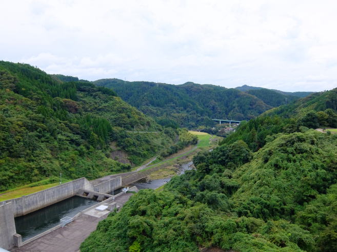ダム堤体の上部は通行ができるようになっていて、堤上から下流側を眺められる