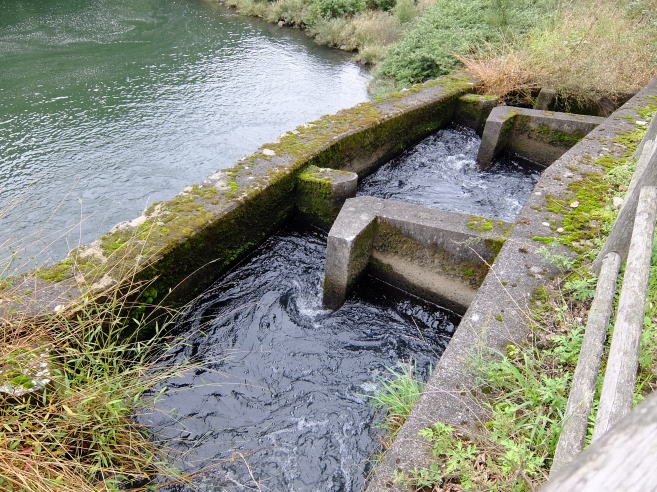 堰堤の端には遡上する魚が休憩しながら上れるような構造になっている。
