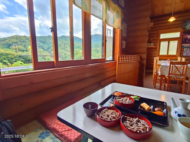 窓越しに白椿大橋を眺めながらの名物の割子そばは、色が黒くてコシが強くて満足度の高い