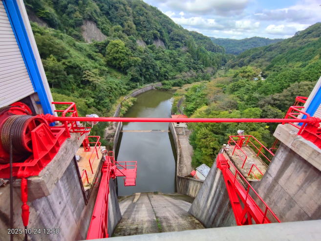 布部ダムは赤く塗られた鉄骨が印象的です。