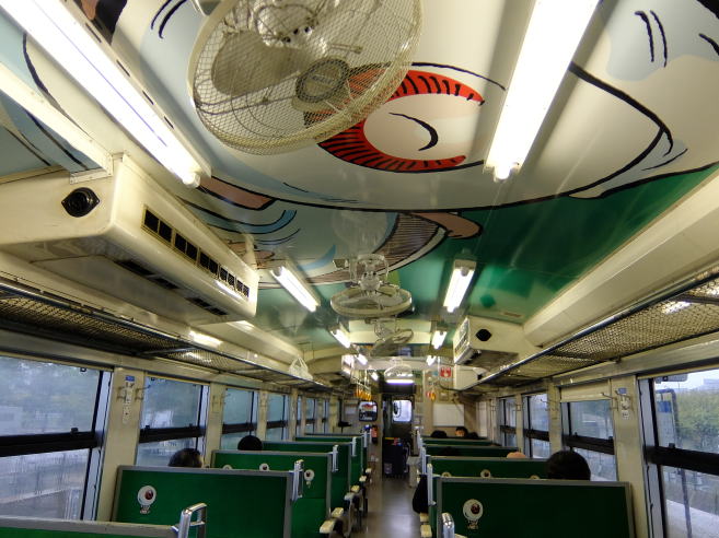 JR境線を走る鬼太郎列車は、外装だけでなく車内にもイラストが描かれているのがすごい。